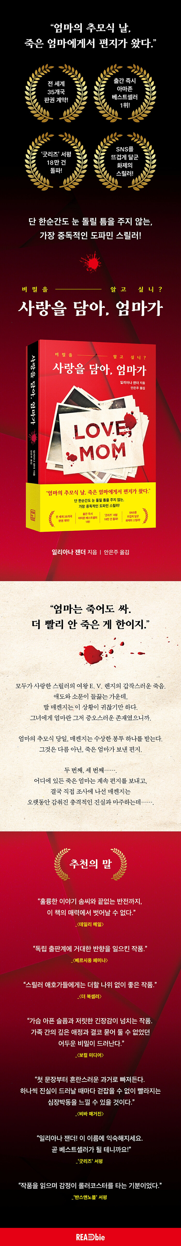며칠 전에 죽은 엄마가 계속 편지를 보낸다? 심지어 그 편지들이 충격적인 진실을 가리키고 있다면? 잠시도 눈을 뗄 수 없는 전개로 독자들을 열광케 한 《사랑을 담아, 엄마가》가 리드비에서 출간된다.