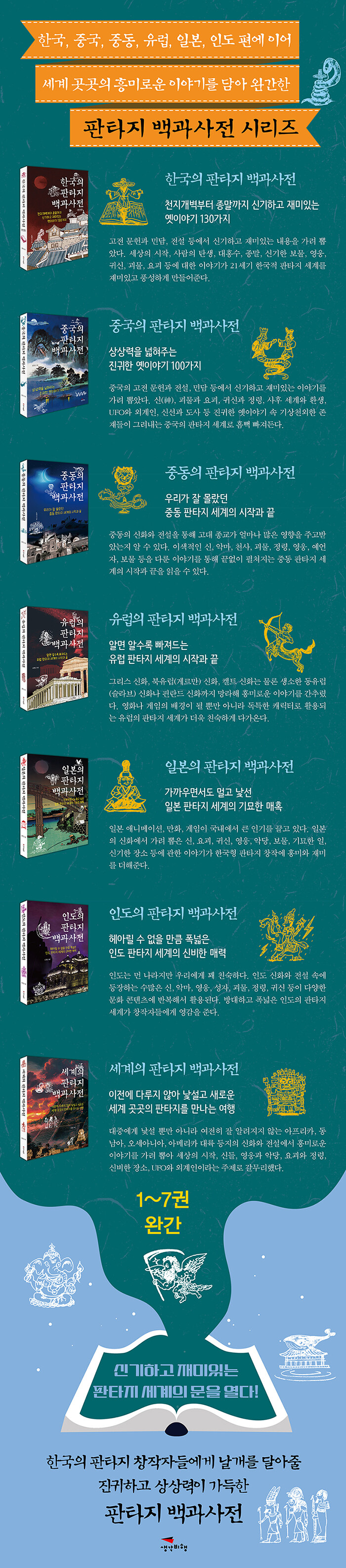 064 이집트 신화의 심판자, 암미트 | 065 필리핀 신화의 요괴와 정령 | 066 미노카와와 티그마마누칸 | 067 필리핀 신화의 흡혈귀들 | 068 일로카노족의 요괴와 정령 | 069 인도네시아 신화의 요괴와 정령 | 070 미국 뉴저지주의 괴물, 저지 데블 | 071 미국의 나방 인간, 모스맨 | 072 식인과 탐욕의 화신, 웬디고 | 073 북미 숲속의 괴물, 빅풋 | 074 천둥새와 파몰라 | 075 북미 원주민 벽화 속 괴물, 피아사 | 076 그린란드 이누이트의 요괴, 아들렛 | 077 태평양 전설의 요괴, 상어 인간 | 078 호주의 수수께끼 요괴, 버닙 | 079 호주의 기이한 생물, 요위 | 080 호주 원주민 전설의 요괴와 정령 1 | 081 호주 원주민 전설의 요괴와 정령 2 | 082 호주 원주민 전설의 요괴와 정령 3 | 083 축치족의 요괴, 켈레트 | 084 네네츠족 신화의 난쟁이 종족, 시르티아 | 085 시베리아 원주민 신화의 요괴들 | 086 튀르크족의 요괴와 정령 | 087 멜라네시아의 요괴와 정령 | 088 멜라네시아의 마녀, 요요바 | 089 오나족의 식인 거인, 차시켈 | 090 브라질 투피·과라니족의 요괴 | 091 중남미의 흡혈 괴물, 추파카브라 | 092 마푸체족의 요괴들 1 | 093 마푸체족의 요괴들 2 | 094 남미 전설의 여성 요괴, 파타솔라 | 095 베네수엘라 전설의 괴물, 사요나와 실본 | 096 아즈텍 신화의 괴물, 시팍틀리 | 097 토타 호수의 괴물 | 098 이로쿼이족 전설의 요괴, 날아다니는 머리 | 099 이로쿼이족 전설의 요괴들 | 100 이누이트의 요괴들 | 101 아프리카의 요괴와 정령 1 | 102 아프리카의 요괴와 정령 2 | 103 아프리카의 요괴와 정령 3