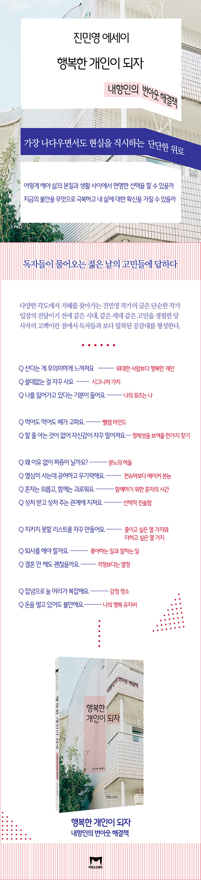 젊은 세대의 불안·관계·진로 고민에 내향인 작가 진민영이 현실적인 번아웃 해법을 제시한다. 삶의 본질과 선택의 균형, 자존감과 공허함, 관계의 피로를 구체적으로 다루며 운동·창조성·정체성 찾기 같은 실천적 조언으로 단단한 홀로서기를 돕는다.