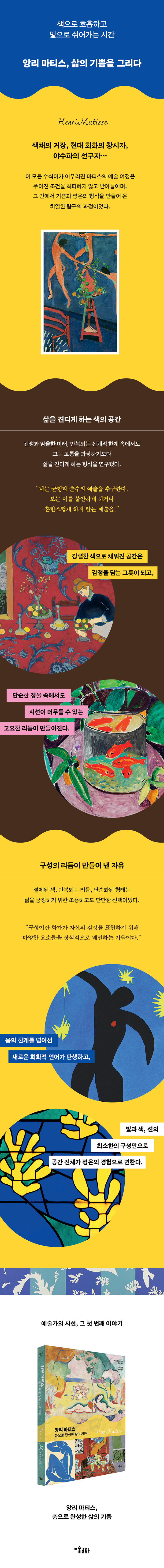 작품 해설이나 연대기를 단순 나열하는 기존의 접근에서 벗어나 예술가의 태도와 문제의식을 살펴보는 『예술가의 시선』 시리즈. 색채의 거장 앙리 마티스가 지병과 전쟁, 말년의 수술 이후에도 “이러한 조건 속에서 나는 무엇을 할 수 있는가?”라는 질문으로 작업을 이어 간 과정을 따라간다.