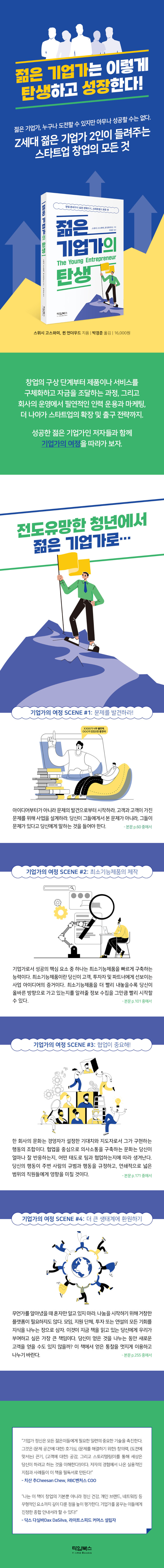 창업을 구상하기 시작하는 단계부터 솔루션으로서 제품이나 서비스를 구체화하고 자금을 조달하는 과정, 그리고 회사의 운영에서 필연적인 인력 운용이나 마케팅, 확장 및 출구 전략까지… 기업가로서의 여정, 특히나 젊은 기업가가 걷는 길에서 마주칠 모든 대상과 풍경을 다양한 인물과 사례를 통해 알기 쉽게 설명했다.
