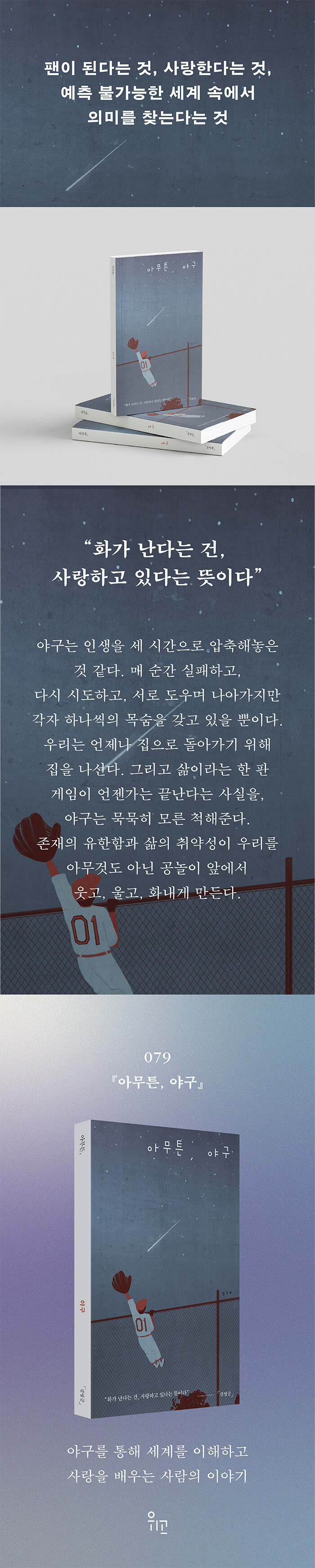 아무튼 시리즈 79번은 예술가이자 독립출판인 김영글의 『아무튼, 야구』이다. 저자 김영글은 피구 공을 두려워하는 어린이, 구기 종목을 달가워하지 않는 청소년을 거쳐 당구공 몇 번 쳐본 것이 전부인 성인이 되었다. 공과는 거리가 먼 삶을 살았던 그에게, 어느 날 야구공이 나타났다.