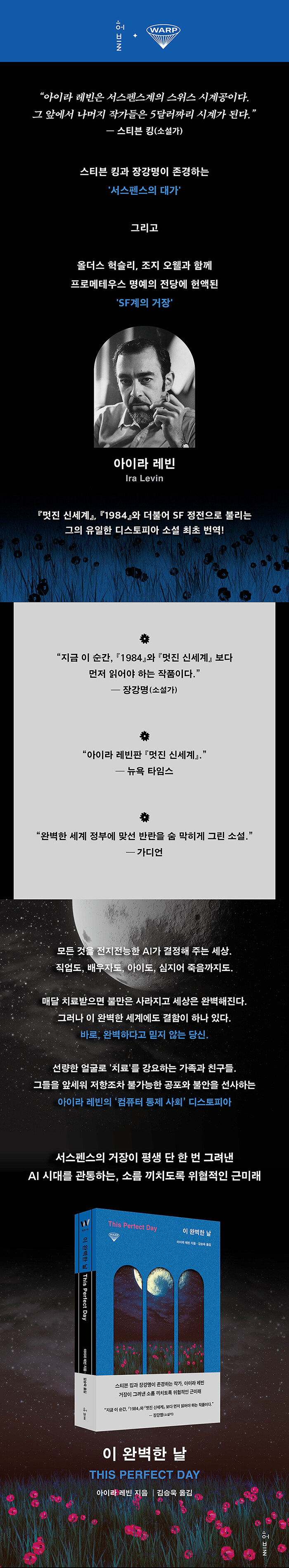 허블에서 아이라 레빈의 장편소설 『이 완벽한 날』이 출간되었다. 아이라 레빈은 미스터리·스릴러·서스펜스 장르에서 독보적인 위치를 차지하는 작가로, 스티븐 킹이 "서스펜스계의 스위스 시계공"이라 칭송했을 만큼 그의 존재감은 압도적이다. 첫 장편 『죽음의 키스(A Kiss Before Dying)』로 미스터리·스릴러 분야 최고 권위의 문학상인 에드거 앨런 포 신인상을 수상한 데 이어, 두 번째 장편 『로즈메리의 아기(Rosemary's Baby)』는 로만 폴란스키 감독의 영화 〈악마의 씨〉로 제작되며 전 세계적인 반향을 일으켰다. 이후 『브라질에서 온 소년들(The Boys from Brazil)』을 비롯해 10편 남짓의 작품을 발표하면서 독자의 사랑과 평단의 인정을 두루 받았으며, 브램 스토커 평생공로상과 에드거 그랜드 마스터상을 수상하면서 서스펜스계의 거장으로 확고히 자리매김했다. 그런 그가 유일하게 남긴 SF 장편이 있으니, 바로 『이 완벽한 날』이다.