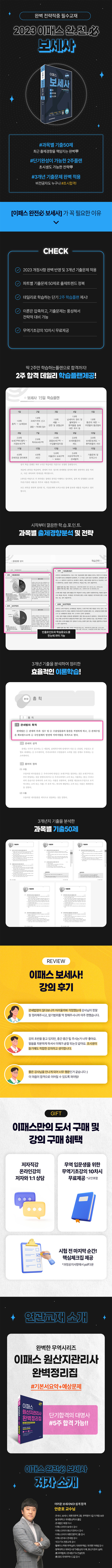 2023년 최신 법령을 바탕으로 이론 및 출제경향을 완벽히 반영했다. 실제 시험난이도를 반영한 실전모의고사를 수록하여, 시험 전 자신감은 높이고 긴장감을 낮췄다. 또한 각 과목별 출제율을 분석하여 기출문제를 수록하여 복습 및 심화 학습이 가능하다.