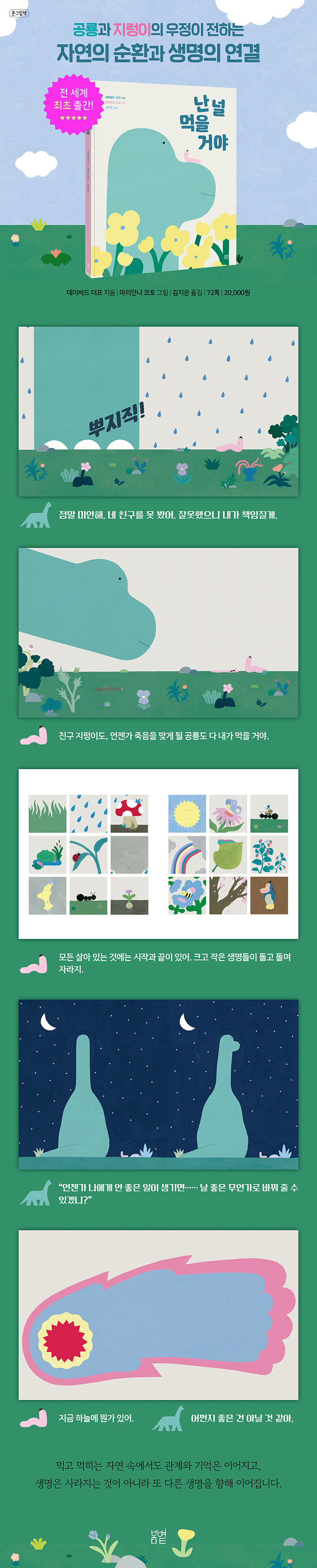 지렁이와 공룡의 우정을 통해 먹고 먹히는 세계를 생명의 순환으로 그린 생태 그림책이다. 미안함과 책임감, 공존의 감정을 섬세하게 담고 유머와 따뜻함으로 관계와 기억이 이어지는 자연의 섭리를 전한다.