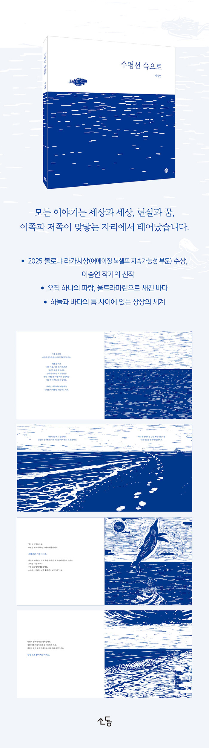 이 책의 모든 그림은 리놀륨 판화로 만들었습니다. 칼로 새긴 선은 단단한 흔적을 남깁니다. 작가님은 그 선을 따라가며 수평선의 이야기를 풀어놓습니다. 이 책에서 선은 나누는 도구가 아니라, 이어주는 어떤 것입니다.