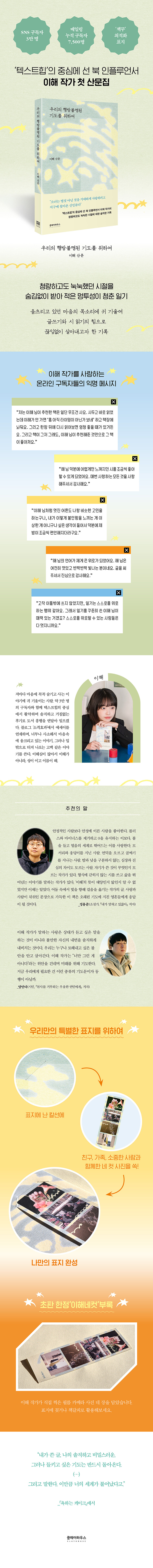 3만 구독자와 함께 ‘텍스트힙’을 이끌며 새로운 독서 문화를 만들어가고 있는 북 인플루언서 이해 작가의 첫 에세이 『우리의 행방불명된 기도를 위하여』가 출간되었다. 메일링 서비스와 블로그 연재를 통해 마치 유리병에 담긴 편지처럼 세상에 내보낸 글들을 엮은 책으로, 소설가 정용준은 “어둠 속에서 빛을 향해 걸음을 옮기는”, “오래된 기도에 지친 영혼들에게 응답이 될” 작품이라며 추천의 말을 더했다. 이해 작가는 솔직한 독서 후기를 써내는 인플루언서로서, “추천한 책은 일단 무조건 사”게 되는, SNS 독서 문화의 믿음직한 큰 축으로 활약하고 있다. 또한, 그의 진솔한 에세이를 읽은 이들은 “(작가도) 나랑 비슷한 고민을 하는구나”, “내가 이렇게 불안함을 느끼는 게 이상한 게 아니구나”라는 안도감을 느꼈음을 고백하며, 이해가 추천한 책과 그의 글에 무한한 신뢰를 보내기도 했다.
