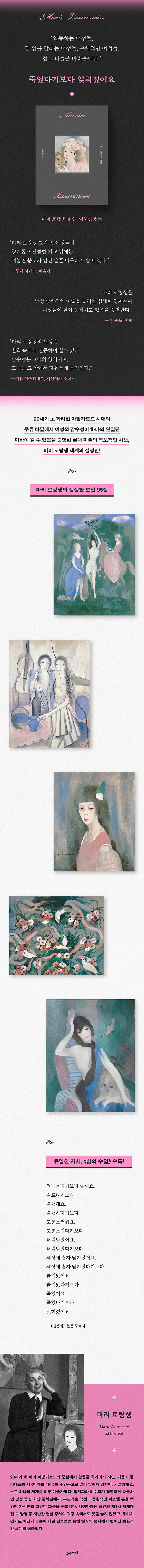 책 《죽었다기보다 잊혀졌어요》는 로랑생이 남긴 유일한 저서인 《밤의 수첩》을 편역하고, 95점의 생생한 도판을 더해 새롭게 구성해 오직 그만의 몽환적이고 아름다운 세계를 오롯이 복원했다. 페이지마다 가득히 담긴 그림과 화폭 뒤에 감춰져 있던 불안과 고독의 문장들은 그 안에서 깊이 공명하며 로랑생을 불러낸다. 그의 세계를 완벽히 체험하고 소장하는 단 하나의 책이다.