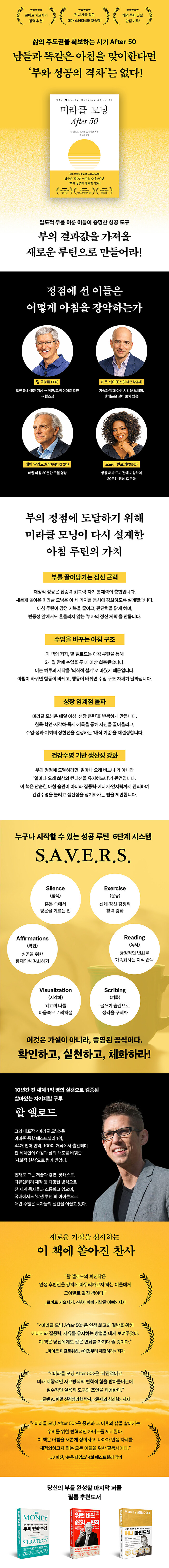 『미라클 모닝 After 50』의 핵심은 전작에서도 소개된 실천법, 세이버스(S.A.V.E.R.S)다. 하지만 이번 책에서 세이버스는 단순한 자기계발 도구가 아니라, 50세 이후의 삶을 위한 언어로 새롭게 확장된다.