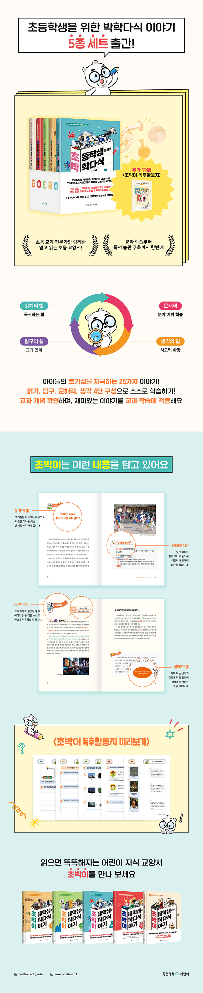 호기심에서 출발해 교과 학습으로 확장되는 초등 교양서 세트다. 《초등학생을 위한 박학다식 이야기 5종 세트》는 사회·과학은 물론 경제와 예술까지, 초등학생이 알아야 할 핵심 상식을 재미있는 이야기로 풀어낸다. “케이팝의 시작이 고구려 무덤에?”처럼 질문이 이어지며 읽는 재미를 높인다.