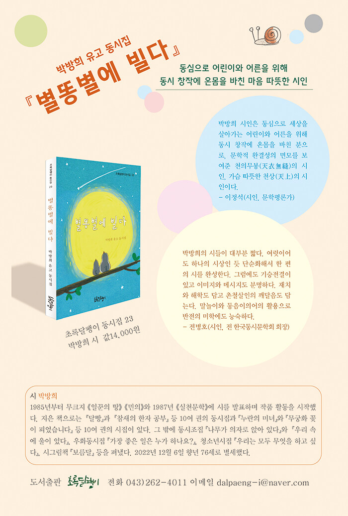 초록달팽이 동시집 스물세 번째 권이다. 활달한 상상력과 선명한 이미지, 실험성이 강한 작품으로 한국 동시 문단에 뚜렷한 발자취를 남긴 고 박방희 시인의 유고 동시집이다. 생전에 시인이 남긴 많은 작품 가운데 가려 뽑은 동시 54편이 실려 있다.