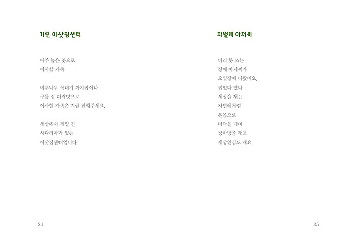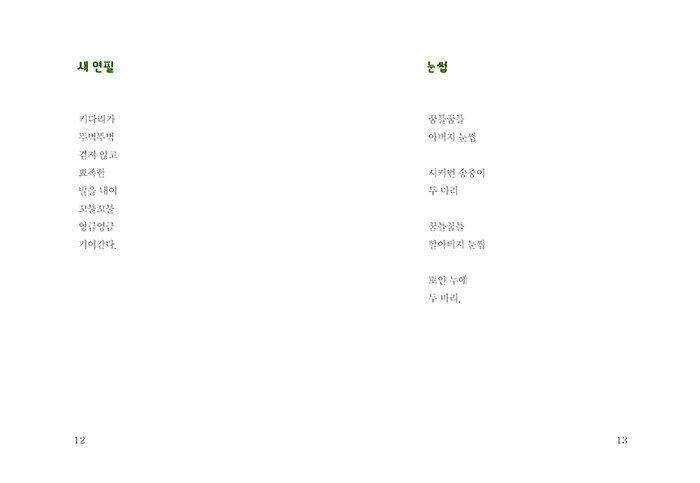 새 연필 12 | 눈썹 13 | 빗자루 14 | 첫눈 15 | 할머니 16 | 할매 손 18 | 비 오는 날3 21 | 신천의 오리들 22 | 비둘기 구구단 23 | 기린 이삿짐센터 24 | 자별레 아저씨 25 | 밥 먹는 눈사람 26 | 눈길 징검다리 27 | 동지 해님 28 | 고드름 링거 29