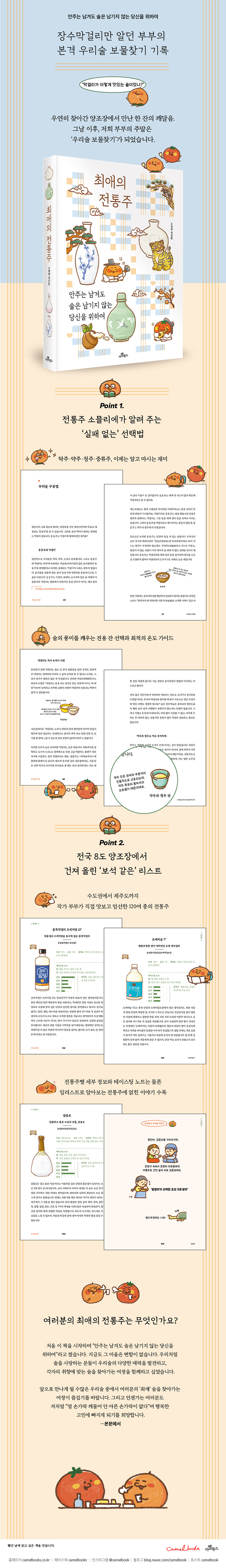 지역별 전통차를 취재하러 전국을 누비던 인스타그램 웹툰 작가 조대봉(아내)과 토망씨(남편) 부부. 어느 날 우연히 방문한 강화도의 양조장에서 막걸리 한 잔에 마음을 빼앗긴 뒤, 이들의 여정은 ‘전통주 보물찾기’로 변모한다. 『최애의 전통주』는 쌀과 누룩이 빚어낸 구수한 막걸리부터 정갈한 약주, 이슬처럼 깨끗한 증류식 소주까지 저자 부부의 마음을 사로잡은 보석 같은 우리술 이야기들을 담고 있다.