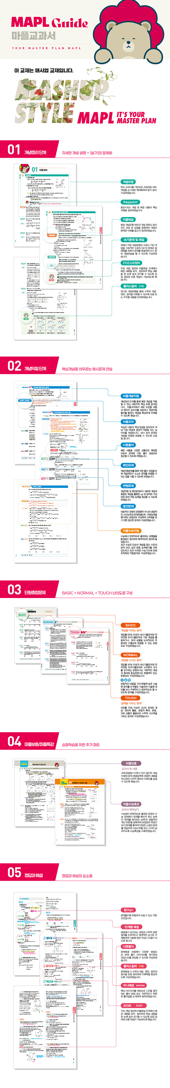 개념서와 문제집이 한 권으로 이루어진 단권화 교재다. 반복적인 문제의 흐름을 가졌으며, 확인, 변형, 발전문제의 심화된 고난도 문제를 통해 수학의 힘을 기른다. 학교 내신뿐만 아니라 전국연합모의고사 대비, 평가원모의고사 및 수능을 대비하는 복합적인 사고력을 기르는 교재다.