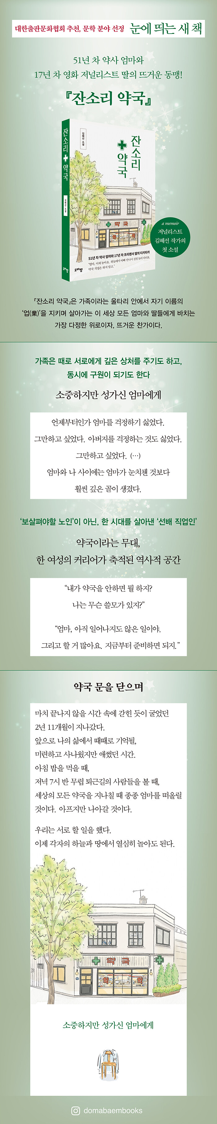약사인 엄마와 프리랜서 딸이 함께 살아가는 일상의 기록이자, 작가 자신의 경험을 바탕으로 쓴 자전적 소설이다. 오랜 세월 약국을 지켜온 엄마의 삶과 다시 그 약국으로 돌아온 딸의 시간이 교차하며 이야기가 펼쳐진다.