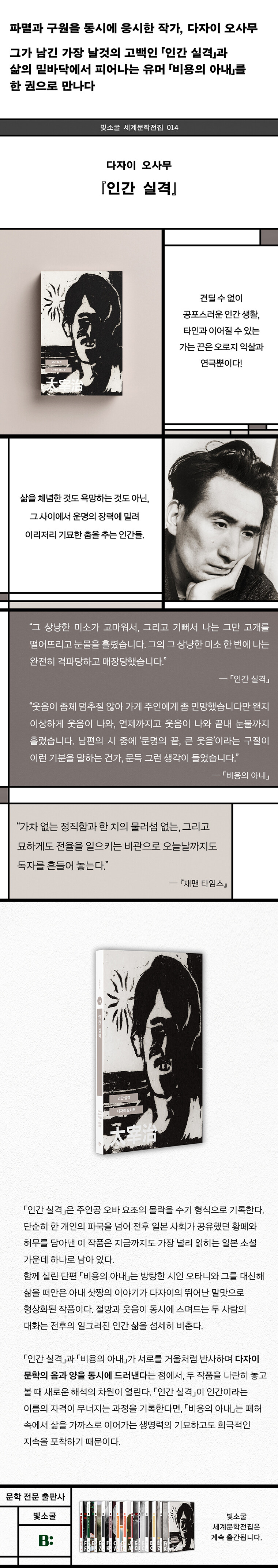 빛소굴 세계문학전집 14번으로, 다자이 오사무의 가장 유명한 걸작 「인간 실격」과 같은 시기에 쓰인 단편이자 숨겨진 명작 「비용의 아내」를 묶어 선보인다. 「인간 실격」은 “부끄럼 많은 인생을 보내왔습니다”라는 고백으로 시작해 주인공 오바 요조의 몰락을 수기 형식으로 기록한 작품이다.