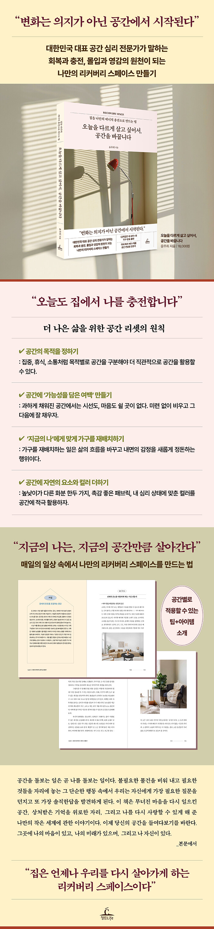 대한민국 대표 공간 심리 전문가 윤주희 대표는 이 책을 통해 공간이 품은 놀라운 치유의 힘과 이 같은 회복의 공간을 만들기 위한 실천 방법을 소개한다. 그저 멋지고 보기 좋은 집이 아닌 마음이 편안한 집, 나다운 집, ‘내가 살고 싶은 인생’과 닮은 집을 만드는 법을 때때로 공간 심리학의 언어를 빌려, 때때로 작가가 만난 여러 공간의 사례와 함께 안내한다. 아울러 집 안 곳곳을 ‘리커버리 스팟’으로 만들기 위한 설계 포인트와 소품 추천까지 한데 담아, 어디서부터 어떻게 손을 대야 할지 막막한 공간 초보자들도 쉽게 따라 할 수 있도록 도와준다.