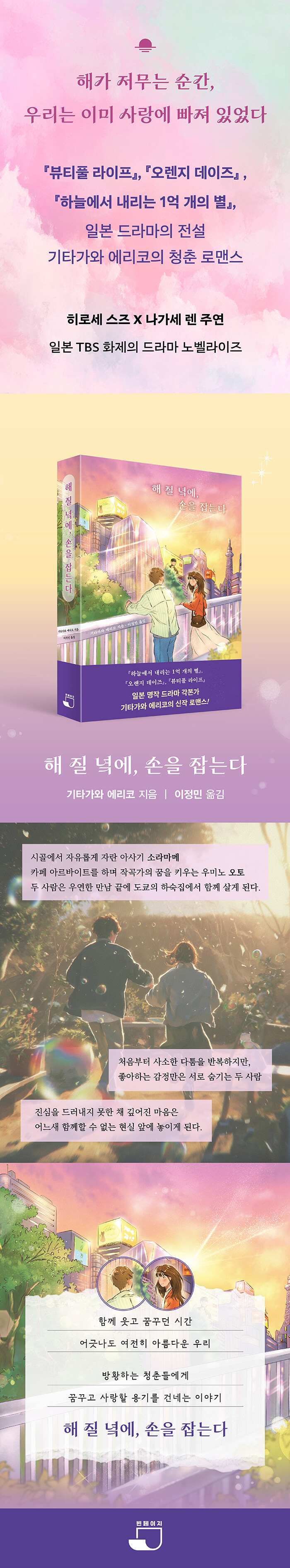 《해 질 녘에, 손을 잡는다》는 자꾸 어긋나기만 하는 애틋한 사랑과 함께 꿈을 향해 순수한 열정을 품어본 이들을 격려하는 이야기다. 청춘은 감정이 가장 강렬해지고 상처가 유독 선명해지는 시기지만 우리는 그 시절을 가장 찬란하다 여긴다. 저무는 햇빛이 만들어내는 짧은 석양의 순간처럼 말이다.