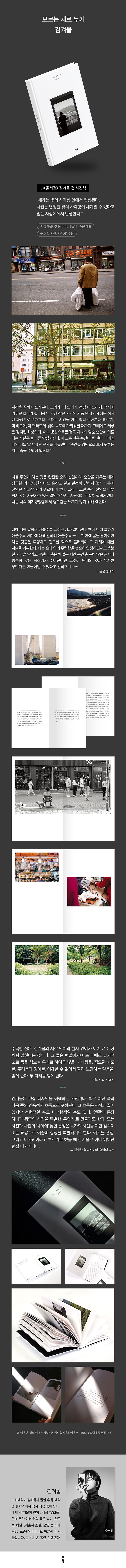 사진 사이사이에 놓인 글 또한 이 책의 중요한 축이다. 김겨울 특유의 감도 높은 문장들은 사진을 설명하거나 규정하기보다, 이미지와 긴장 관계를 이루며 독자의 사유를 확장시킨다. 사진과 글은 서로를 보완하거나 종속시키지 않은 채 긴장 관계를 유지하며 나란히 걷는다. 글은 단순히 사진에 대한 설명이나 증거 자료가 아닌, 이야기를 이끌어나가는 추상적이면서도 구상적인 서사의 재료가 된다. ‘사진’이라는 주체 자체에 대한 단상도 있다. 어엿한 아마추어 사진가로서 견지해온 사진의 의미에 대한 사유는 깊고 넓다.