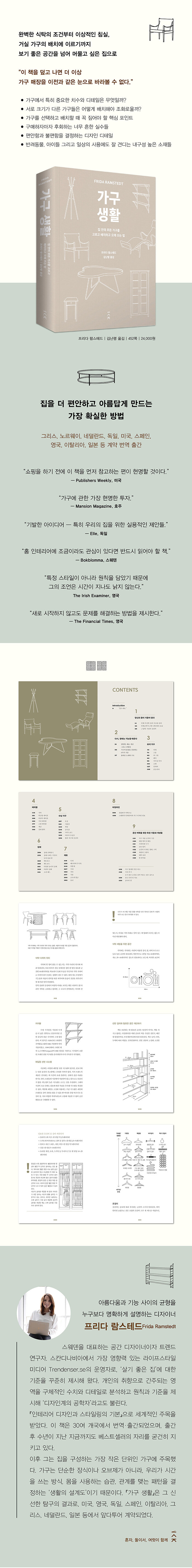 좋은 가구와 그렇지 못한 가구를 가르는 기준은 무엇일까? 직접 사용해보기 어려운 오늘날의 유통 환경에서 값비싼 실수를 피하려면 무엇을 미리 알아야 할까. 취향에는 정답이 없지만, 더 나은 선택에는 분명한 기준이 있다. 책은 테이블과 좌석의 이상적인 거리, 동선 확보를 위한 최소 간격, 수면과 휴식을 고려한 침대와 협탁의 비율 등 생활의 질을 좌우하는 수치와 원칙을 명확히 제시한다. 또한 목재·패브릭·가죽·금속 등 소재별 관리법과 가구의 수명을 늘리는 사용법까지 체계적으로 정리했다. 디자인의 기본 문법을 이해하면, 시각 정보만으로도 자신에게 맞는 가구인지 아닌지를 가려낼 수 있음을 증명하며 ‘가구를 읽는 법’을 전한다.