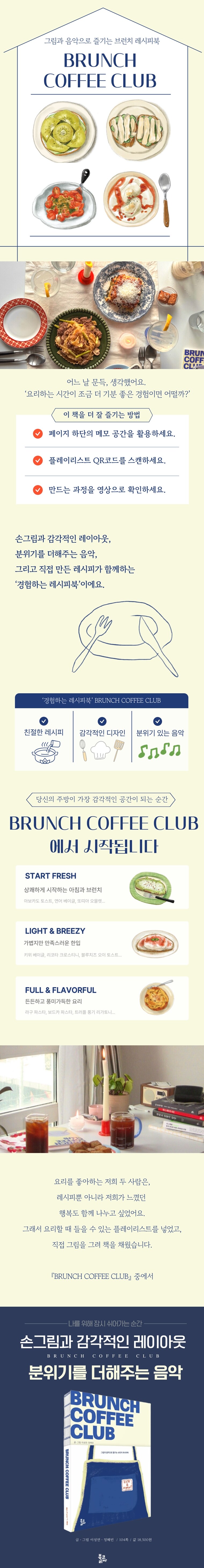느긋한 주말 아침, 커피를 내리고 브런치를 차리며 나만의 시간을 보내고 싶은 이들을 위한 감성 레시피북.《브런치 커피 클럽》은 요리를 좋아하는 두 친구가 기획부터 요리, 그림, 디자인, 음악까지 직접 손으로 완성한 ‘경험하는 레시피북’이다.