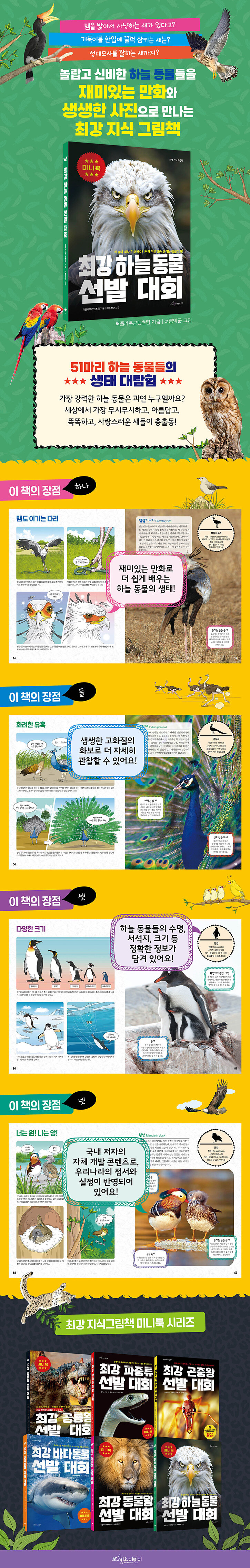 생물 도감은 주로 해외에서 수입하는 경우가 많아요. 하지만 《최강 하늘 동물 선발 대회》는 기획부터 제작까지 순수 국내 개발로 이루어졌기에 그 어떤 책보다도 더 국내 정서와 실정에 맞는 콘텐츠를 지니고 있어요. 전 세계에서 유명한 새들뿐 아니라 우리나라에서 만날 수 있는 친근한 새들도 담겨 있어 더 뜻깊은 책이랍니다!