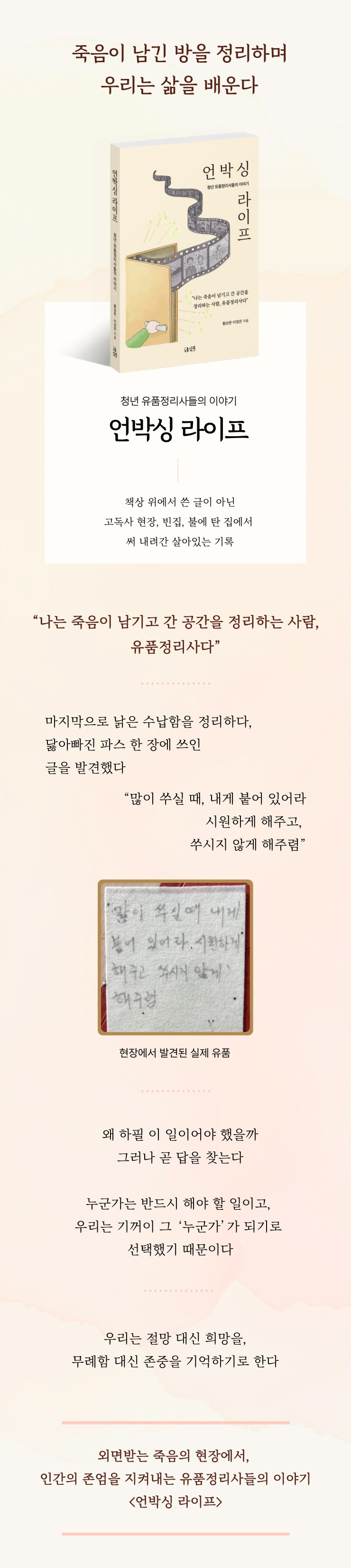 이 책은 지난 5년간 내가 멀쩡한 직장을 그만두고 유품정리사가 되기로 한 순간부터, 수많은 현장에서 만난 사람들과 정리한 공간에 대한 기록이다. 하지만 이 책의 주인공은 나 자신이 아니라, 이름 없는 누군가의 11권의 일기장, 돌아가신 뒤에야 발견된 수의, 그리고 수 백개의 빈 맥주병일지도 모른다.