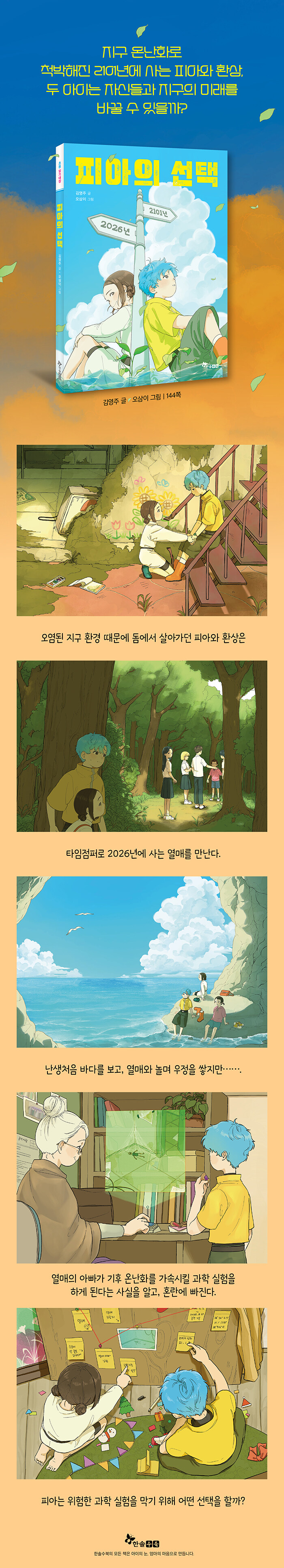 이야기 속 ‘피아의 선택’은 우리의 수많은 선택에 경종을 울립니다. ‘나 자신’을 위해, ‘지금’ 조금 더 편하기 위한 여러 선택들이 ‘우리 모두의 미래’를 얼마나 위협하고 있는지 생각하게 합니다. ‘기후위기’라는 말에 무디어져 있는 오늘, 잘못된 선택으로 열매와 피아, 환상이 누려야 할 하늘과 바다를 빼앗고 있는 건 아닐까요?