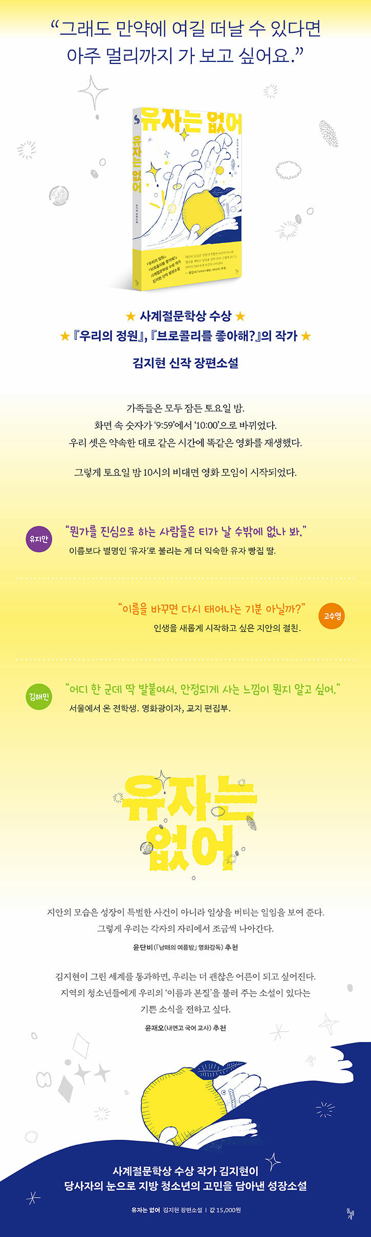 지금 청소년문학에서 고유한 자리를 만들어 가는 김지현 작가의 신작 장편소설. 제20회 사계절문학상 대상을 수상하며 작품 활동을 시작한 김지현 작가는 그간 아이돌 ‘덕질’(『우리의 정원』), 동물권과 채식(『브로콜리를 좋아해?』), 꿈과 무의식(『너의 꿈에도 내가 나오는지』) 등 청소년소설에서 거의 다루지 않았던 소재로 소설을 써 왔다. 인물의 내면을 세밀하게 그리면서도 인간이라면 느껴 보았을 법한 미묘한 정서를 포착해 독자의 공감을 불러일으키는 작가의 힘이 느껴진다. 『유자는 없어』는 작가의 고향인 거제도를 배경으로 한 성장소설로, ‘성인이 되어 고향에 남을지, 아니면 새로운 도시로 떠날지’처럼 지방 청소년이 느낄 법한 감정이나 고민을 ‘당사자’ 문학으로 담아냈다.