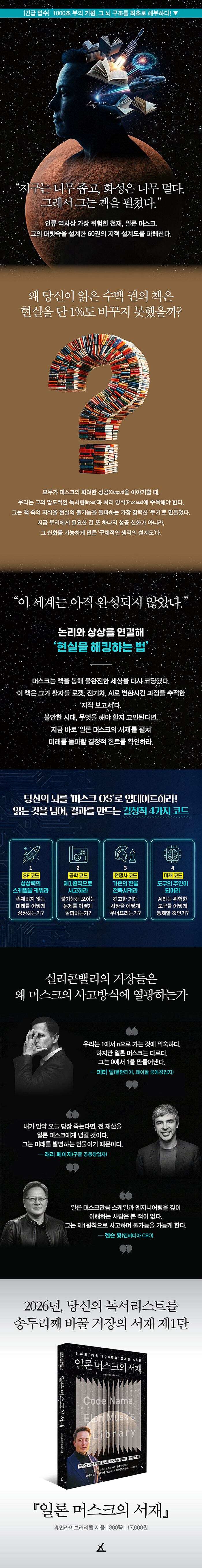 · CODE 2. 공학 코드 (제1원칙): 남들이 불가능하다고 할 때, 그는 『구조란 무엇인가』, 『이그니션!』 같은 공학서를 펼치고 비용 절감의 핵심 원리를 찾아냈다. 복잡한 문제를 가장 기초적인 사실로 쪼개는 ‘제1원칙 사고’의 정수가 담겨 있다.