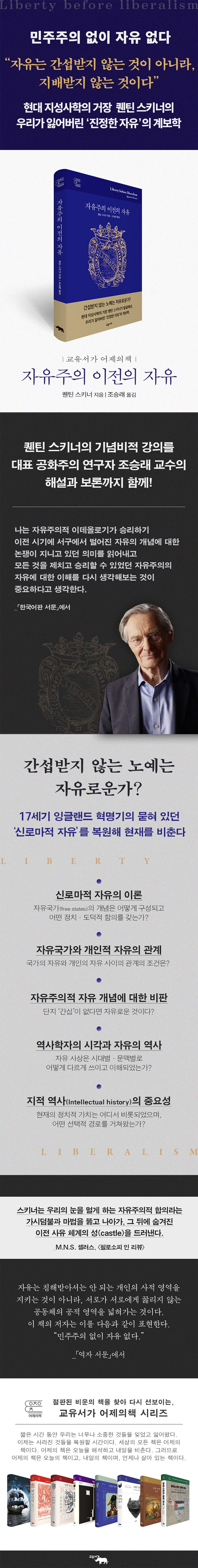 우리가 타인의 선의에 의존해 누리는 자유는 가짜다. 진정한 자유는 우리 모두가 공동체의 평등한 주인으로 설 때 비로소 완성된다. 오늘날 우리가 당연하게 여기는 ‘자유’의 개념에 근본적인 의문을 던지는 책, 지성사학계의 거장 퀜틴 스키너의 고전 『자유주의 이전의 자유Liberty Before Liberalism』가 새롭게 출간되었다. 이 책은 신자유주의적 세계화와 개인주의적 자유관이 지배하는 오늘날, 자유의 진정한 의미를 지성사적 뿌리에서부터 다시 조명하는 기념비적 저술이이다. 2007년 국내에 첫 소개 당시 큰 반향을 일으켰으나 오랫동안 절판되어 독자들의 재출간 요청이 끊이지 않았던 책이기도 하다.