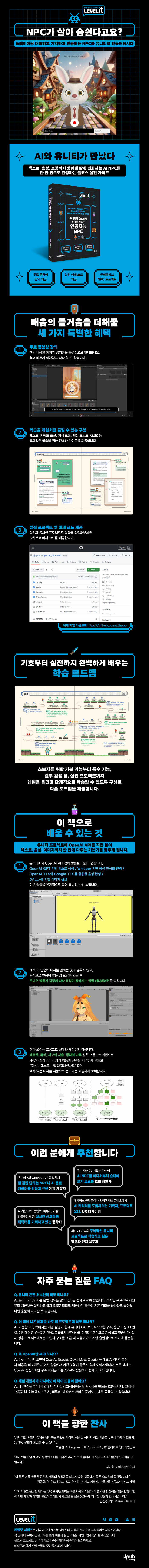 이 책은 단순히 OpenAI API를 유니티에 연동하는 법을 소개하는 기술서가 아니라, 게임 속 캐릭터를 플레이어와 대화하고, 기억하고, 반응하는 하나의 존재로 구현하는 과정을 안내하는 실전 가이드예요.