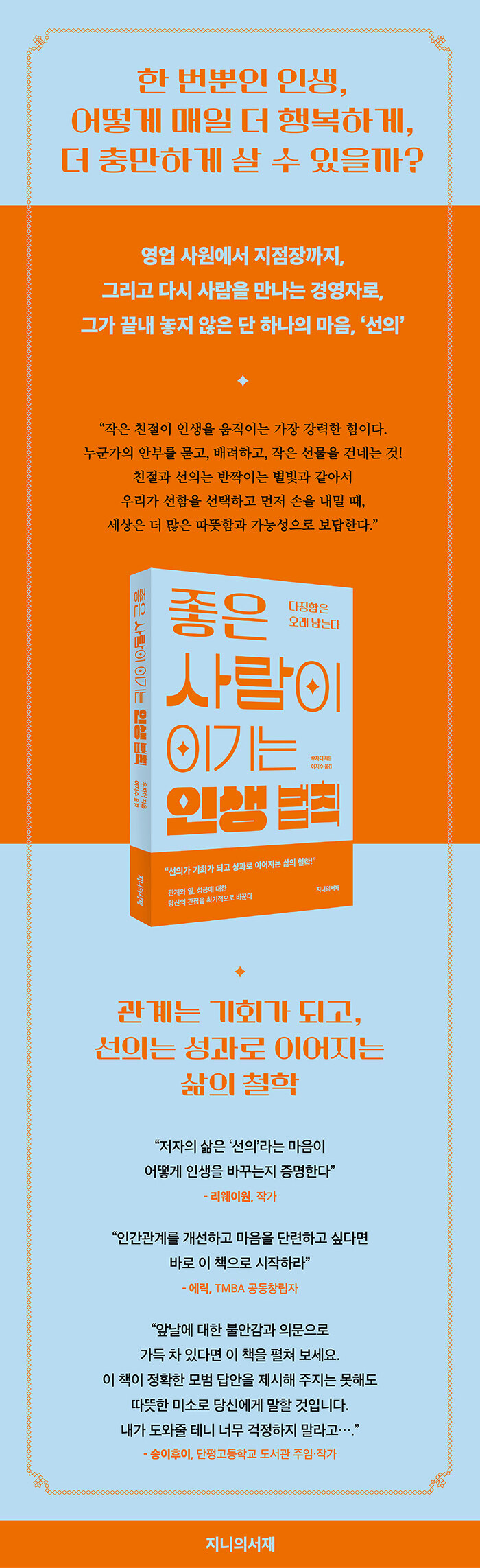저자는 서문에서 선의에 대한 확고한 신념을 제시한다. 진심으로 타인을 대하고 먼저 손을 내미는 선택은 결코 허공으로 사라지지 않으며, ‘선한 인연은 행복으로 돌아온다’고 강조한다. 그는 이 믿음을 증명하기 위해 자신의 삶을 하나의 거대한 실험실로 삼는다.