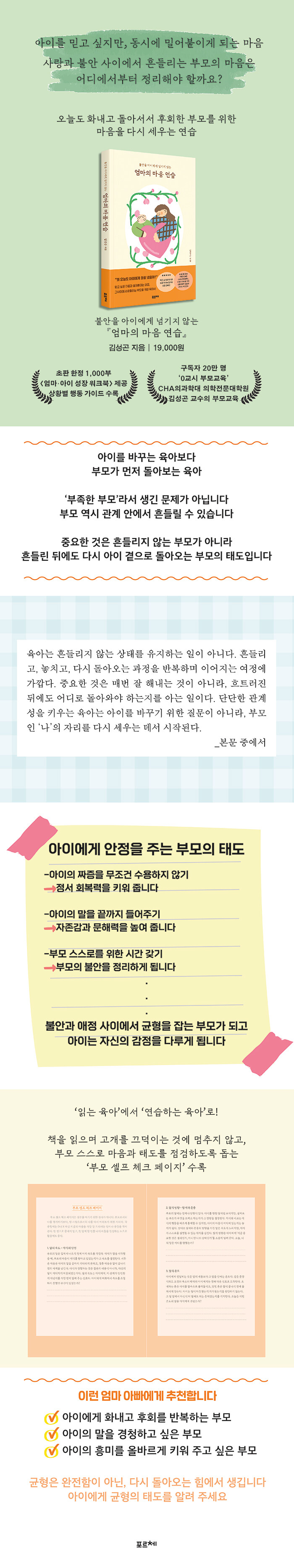 저자는 부모에게 더 잘하라고 말하지 않는다. 아이를 고치기 전에 부모의 마음과 태도를 먼저 돌아보자고 제안한다. 이 책은 육아 과정에서 반복되는 불안과 후회를 부모의 결함으로 규정하지 않고, 관계를 회복해 나가는 출발점으로 다룬다. 부모의 감정 상태와 말투, 관계를 대하는 태도가 아이의 정서 안정과 회복력에 어떤 영향을 미치는지를 차분히 짚으며, 애정과 통제의 균형, 일상 속 학습과 인성의 연결, 안정적인 애착과 정서적 독립까지 폭넓게 살핀다. 특히 각 장의 끝에 수록된 ‘부모 셀프 체크 페이지’를 통해 읽고 이해하는 데서 그치지 않고, 부모가 스스로의 말과 태도를 점검하며 육아의 방향을 다시 세울 수 있도록 돕는다. 완벽한 부모를 요구하지 않고, 흔들린 뒤에도 다시 아이 곁으로 돌아오는 힘을 기르는 것, 그것이 이 책이 전하는 육아의 핵심이다.
