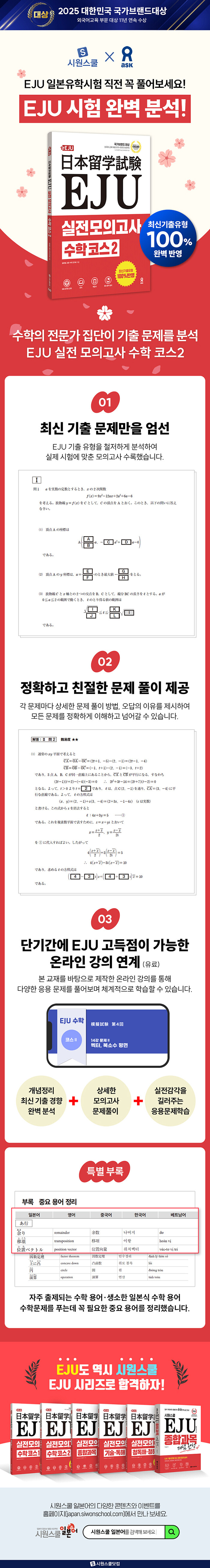 지금까지 실시된 EJU 일본유학시험 수학 코스2의 기출 데이터를 철저하게 분석하여, 시험에 자주 나오는 문제, 배점이 높은 문제를 엄선하여 반영하였습니다. 실제 난이도에 맞춘 문제를 통해 실전 감각을 익히는 동시에 단기간에 확실하게 목표 점수를 달성할 수 있습니다.