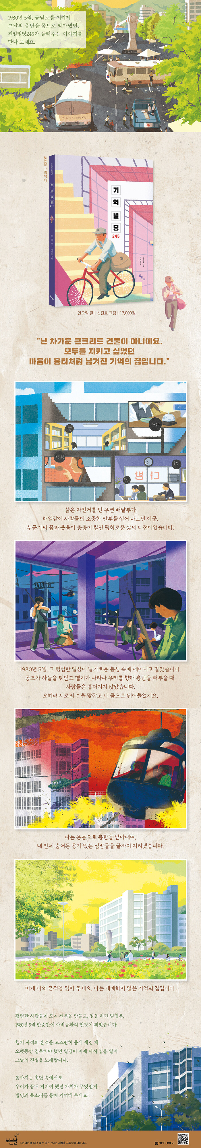 전작 《기억 공장》이 절망 속에서도 희망을 담아 부르는 노래를 전했다면, 이번 《기억 빌딩 245》는 그날의 사람들을 대신해 “우리는 결코 굴복하지 않았다”는 진실을 말합니다. 장소를 옮겨 계속되는 두 작가의 깊은 시선은 우리 곁의 공간들을 다시금 돌아보게 만드는 특별한 감동을 선사합니다.