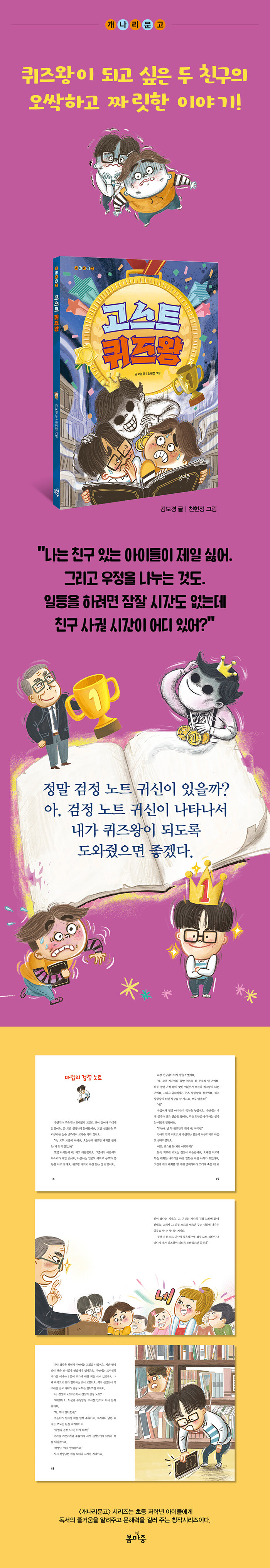 아이들이 일상에서 마주하는 치열한 경쟁과 일등 지상주의라는 무거운 현실을 ‘퀴즈 대회’와 ‘마법의 검정 노트’라는 흥미로운 소재로 풀어낸 작품이다. 정직하지 못한 승리가 가져오는 불안함과 친구를 향한 질투라는 감정을 입체적으로 그려냈다.