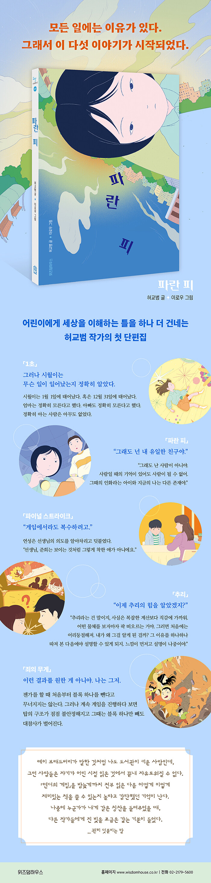 책에 실린 다섯 이야기 「1초」, 「파란 피」, 「파이널 스트라이크」, 「추리」, 「죄의 무게」는 추리, SF, 리얼리즘, 공포 등 장르는 다양하지만 모두 ‘모든 일에는 이유가 있다’는 하나의 주제로 가지런히 여며진다. 작가는 내면의 상처, 차별, 인간의 욕망과 오만, 희생과 속죄 같은 문제를 그대로 쓰지 않고 판타지적 세계, 비틀린 시스템, 특수한 규칙으로 치환해 작품 구석구석에 숨겨 놓았는데, 숨겨진 의미들이 ‘모든 일에는 이유가 있다’라는 메시지와 연결되는 맥락을 발견하는 것은 이 책을 읽는 또다른 즐거움이다.