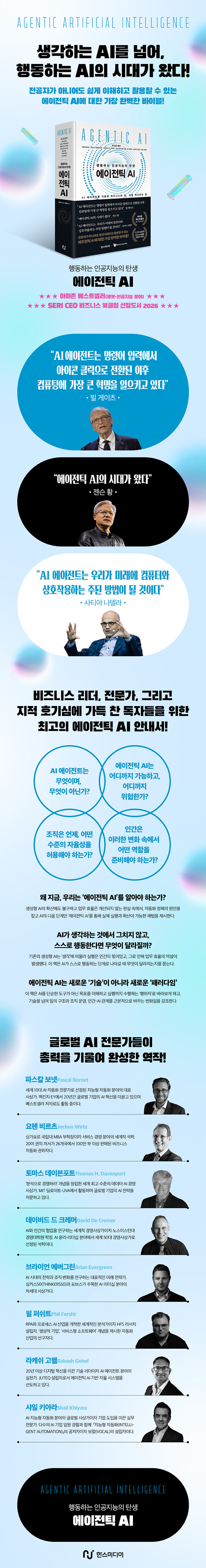 신간 『에이전틱 AI』는 생성형 AI 이후의 다음 단계를 고민하는 경영자와 리더, AI를 실제 업무와 조직에 적용해야 하는 실무자, 자동화와 AI 도입의 한계를 체감한 기획자와 전문가, 기술 변화가 사회와 인간에게 어떤 의미를 갖는지 알고 싶은 독자들에게 최고의 가이드가 되어줄 것이다.