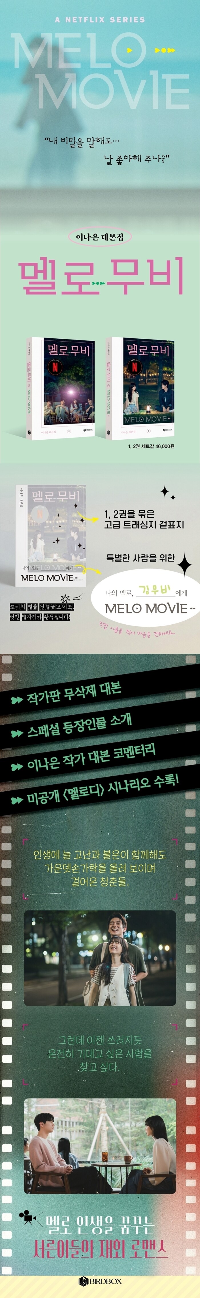 전 세계 넷플릭스 시청자들의 뜨거운 호응 속에 공개되었던 시리즈 〈멜로 무비〉 대본집이 이나은 작가의 오리지널 버전으로 출간된다. 이나은 작가는 이번 작품에서 만남과 이별 그리고 재회라는 소재를 통해 인간의 결핍과 성장 그리고 관계의 의미를 담백하면서도 울림 있게 그려 냈다.