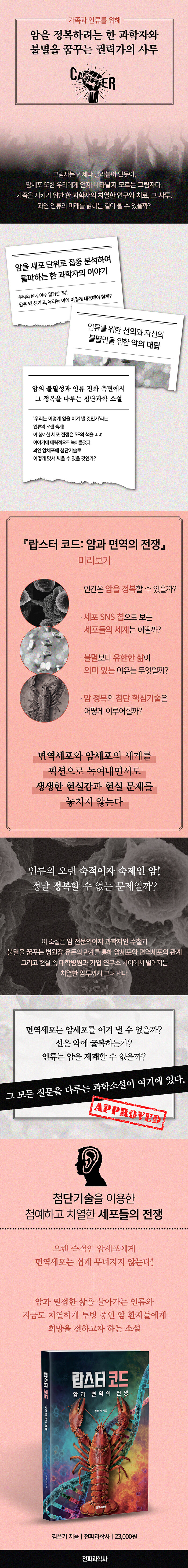 이 책은 암과 싸우는 면역세포들을 도와 딸의 암을 치료하고 암을 정복하려는 주인공 의사와 이를 이용, 불멸을 이루려는 악당과의 싸움 이야기다. 대부분 과학 이야기는 사실(Fact)이며 해당 문헌을 표시했다.