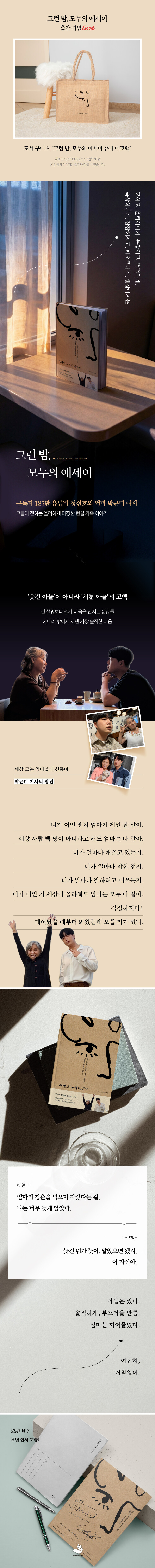 이 책만의 독특한 강점은 아들보다 더 유명한 엄마, 박근미 여사의 참견이 아들의 글마다 사사건건 끼어든다는 데 있다. 솔직하고 거침없는 말투 사이로 불쑥 튀어나오는 인간미, 언젠가 내 부모한테 들어본 것 같은 그 한 마디들이 이내 코끝을 찡하게 만든다. 책장을 넘기다 문득 내 엄마가 떠오르게 하는 투박한 잔소리는 이 책의 가치를 느끼게 하는 ‘정수’가 되었다. 때론 이토록 뚱딴지같을 수 없을 만큼.