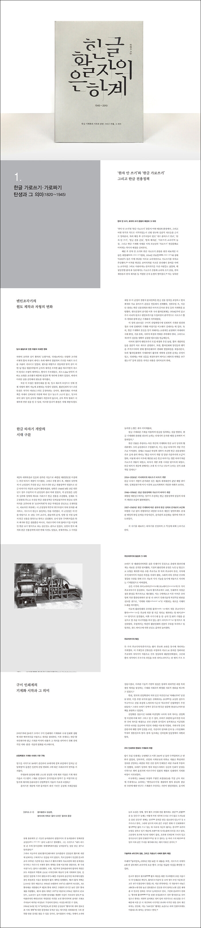 유럽에서 출발한 현대 인쇄술과 그 의미 958 ㅣ 유럽 인쇄술의 동아시아 전파와 그 의미 960 ㅣ 한글 전용정책과 한글 타자기 개발 그리고 그 의미 963 ㅣ가로쓰기-한글 타자기-한자 폐지의 필연성과 그 의미 965 ㅣ 정부의 타자기 문자판 표준화와 그 의미 967 ㅣ 한글 타이포그래피 이론의 점검과 본문 서체의 중요성 970