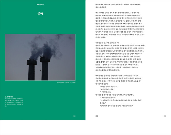 해가 눕자 추위를 견디기가 어려워졌다. 굳이 고통을 분담하는 기분을 느끼고 싶지는 않아서 자리를 떴다. 택시를 잡으려면 몇 킬로미터를 걸어야 했다. 사람을 죽일 것 같은 살기가 바람에 어려 있었다. 공장 정문을 지날 때쯤 여섯시가 됐다. 하늘은 보라색으로 물든 채 서쪽으로 쏠려갔다. 몸을 돌렸을 때, 나는 하늘과 땅을 잇는 동앗줄을 보았다. 바람에 휘청이는 식량꾸러미를 천천히 감아올리는 남자의 검은 실루엣은 마치 물고기를 낚아 올리는 어부처럼 보였다. 그 포획물 속에 스마트폰 배터리가 숨겨져 있을 것이었다. 나는 걸음을 멈추고 황급히 카메라를 꺼낸 뒤 줌을 최대한 당겼다. 솔직히 말하자면, 숭고한 감정보다는 특별한 무엇이 담길 것이라는 확신을 느끼고 있었다.
