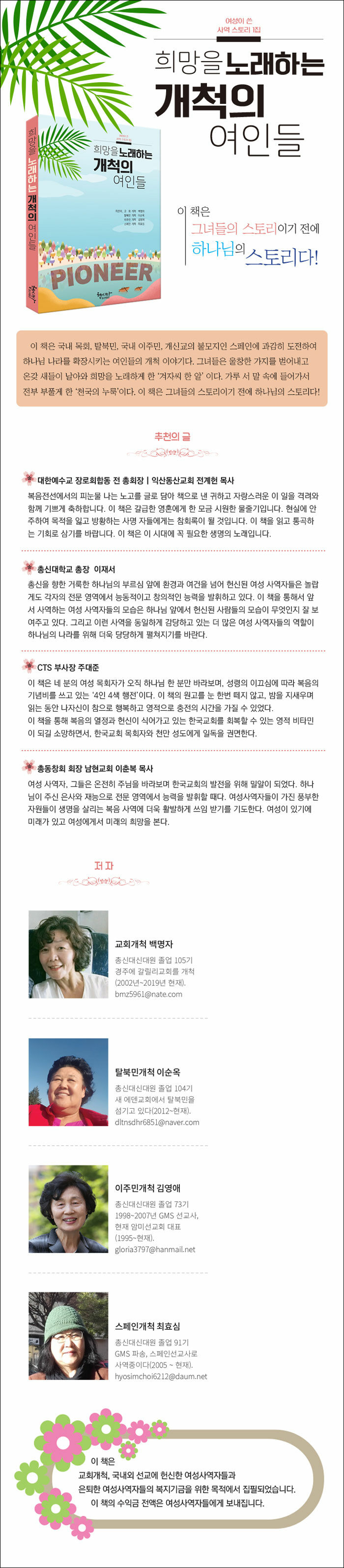 아무쪼록 이 책이 열정과 헌신이 식어가는 한국교회가 신앙을 다시 회복하고 한층 더 성숙하게 되는 신령한 자양분이 되기를 소원합니다. 여성 사역자들의 헌신에 의해 만들어진 이 책의 수익금 전액은 은퇴한 여성 사역자와 현역에서 헌신하는 여성사역자들을 위해서 쓰여집니다.