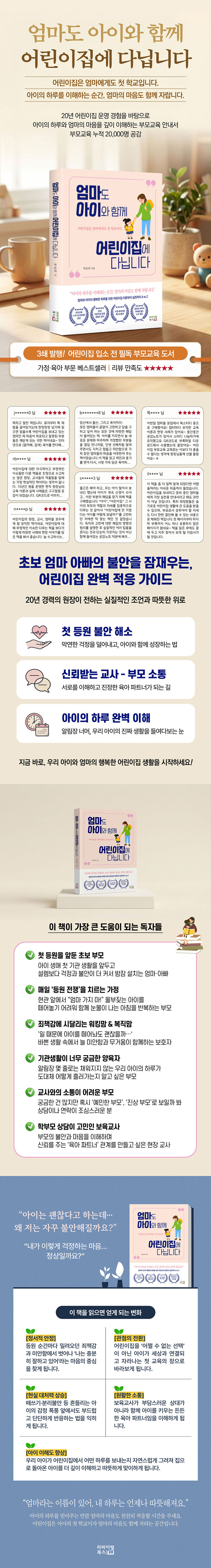 15년 동안 어린이집을 운영하는 현직 원장의 부모교육 안내서. 이론부터 실천까지, 아이와 엄마의 행복한 어린이집 생활을 위한 모든 내용을 고스란히 담은 알찬 교과서가 될 이 책은 어린이집 원장과 교사, 그리고 모든 엄마에게 큰 유익이 될 것이다.