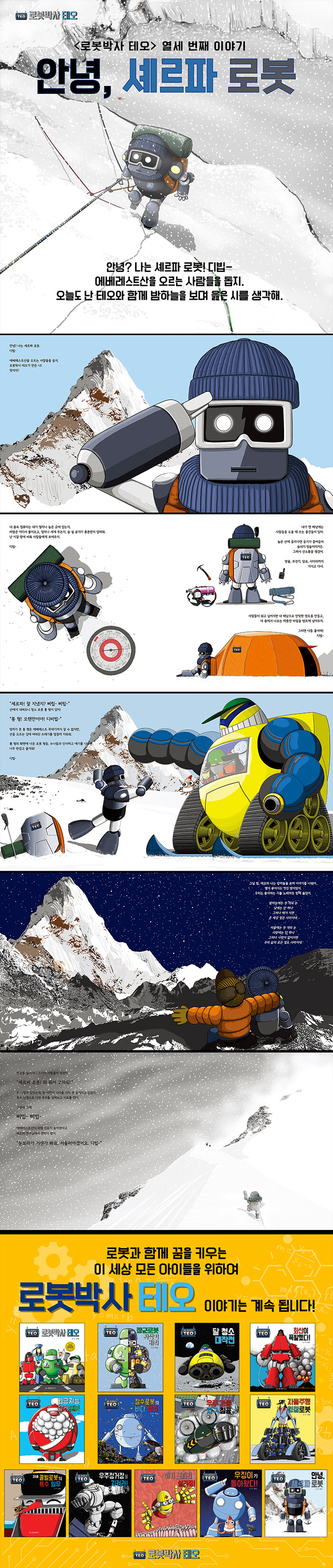에베레스트 산을 오르는 사람들을 돕기 위해 만들어진 셰르파 로봇. 정상에 오르는 안전한 길을 안내하고, 도움이 필요한 사람을 돕기도 한다. 해마다 한번 찾아와 점검해 주는 테오와 에베레스트 밤하늘을 보며 우정을 나눈다. 눈이 많이 내리는 궂은 날, 에베레스트 산에서 구조 요청이 오는데….