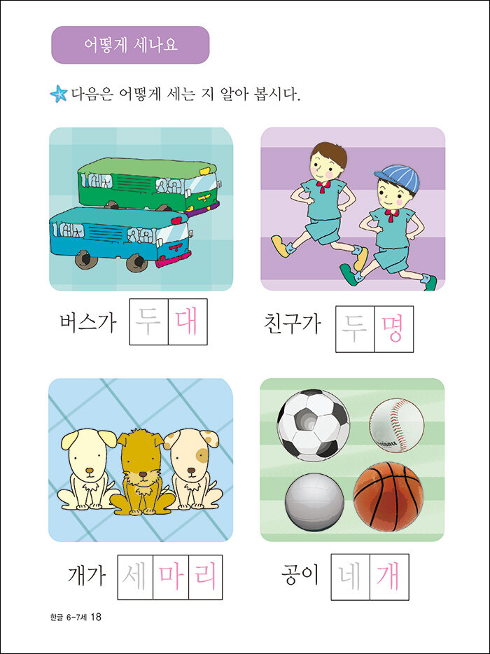 여러 가지 소리와 모양, 색깔, 수량을 세는 단위, 받침이 있는 낱말과, 문장 쓰기, 인사말을 익히고 쓰기와 입학을 준비하는 어린이가 필요한 여러 가지를 익히도록 꾸몄다.