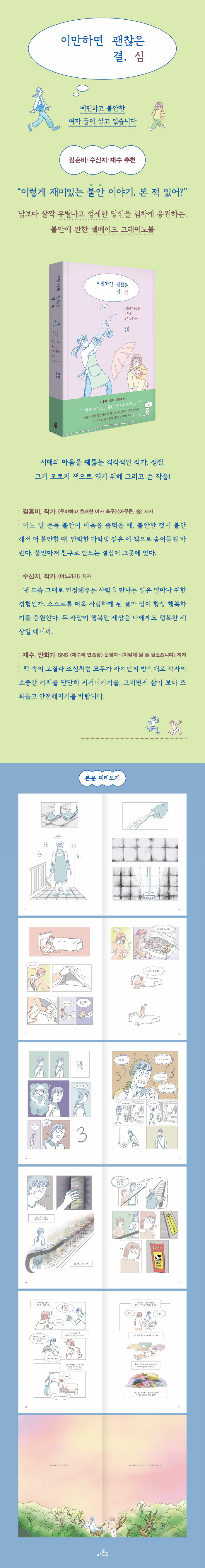 내가 가진 불안을 단점처럼 여겨 꽁꽁 숨기고 살던 사람들, 해소하고 싶어도 과연 누가 공감해줄까 싶어 쉽게 나눌 수 없던 분들이 여기 결이와 심이를 만나서 조금이라도 속이 시원해졌으면 좋겠다. 모두에게 다 그럴만한 이유가 있다는 걸 공감하는 사람이 여기 있으니까. 결이와 심이의 삶은 나의 이야기이기도 하고, 나의 가족이자 내 친구들, 나와 함께 일하신 분들, 우연히 마주치고 목격한 누군가의 이야기들, 또 여러분의 이야기이기도 하다. 그렇게 걱정을 하면서도 정면으로 부딪혀보는 평범하고 평범한 우리가 사실은 가장 용감한 사람들이다. 다시 한 번 난 유리병에 고결과 조심의 이야기를 담아 바다 위에 띄워본다. “너 참 유별나고 이상하다”는 소리를 듣는 사람들에게, 내 살 길을 잘 책임지고 싶은 만큼 불안해하는 당신은 결코 혼자가 아님을 알리는 메시지가 닿기를 바라며…