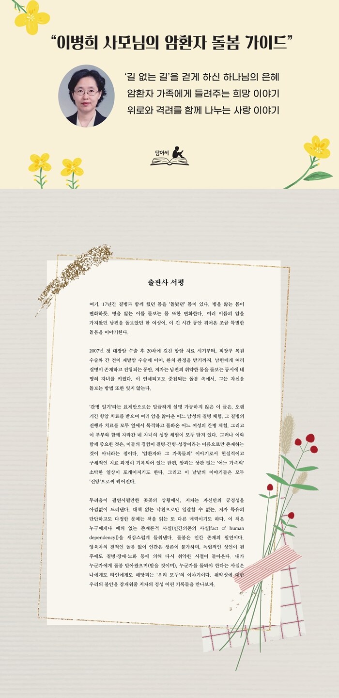 저는 남편이 김희철 교수님 환자가 아니었기에 조심스레 ‘경험방’에 가끔 들어가서 제가 겪는 이야기들을 나누게 되었습니다. 제 경험담을 쓰면서 환자들이나 그 가족들과 서로 격려도 하고 받기도 했던 이야기들을 이번에 책으로 엮어 내게 되었습니다.